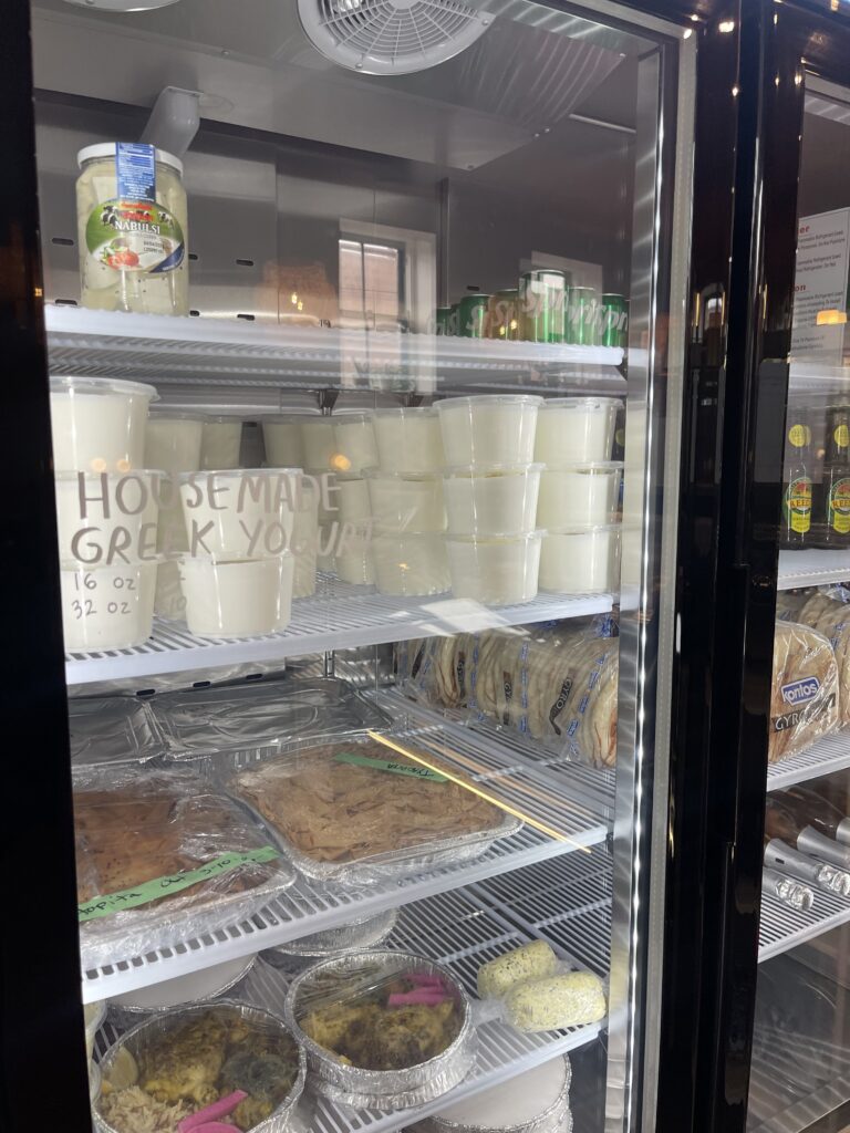 Beyond the dining area, the restaurant also features a curated selection of grab-and-go items, including fresh Greek yogurt, hummus, baked goods, and prepared meals ready to take home.